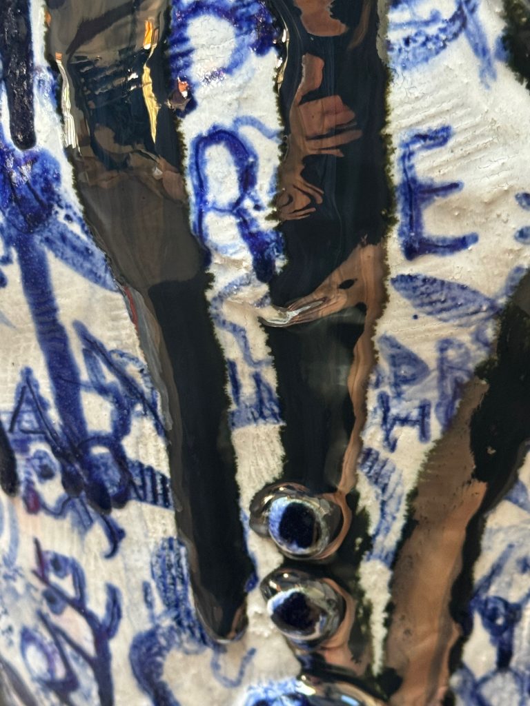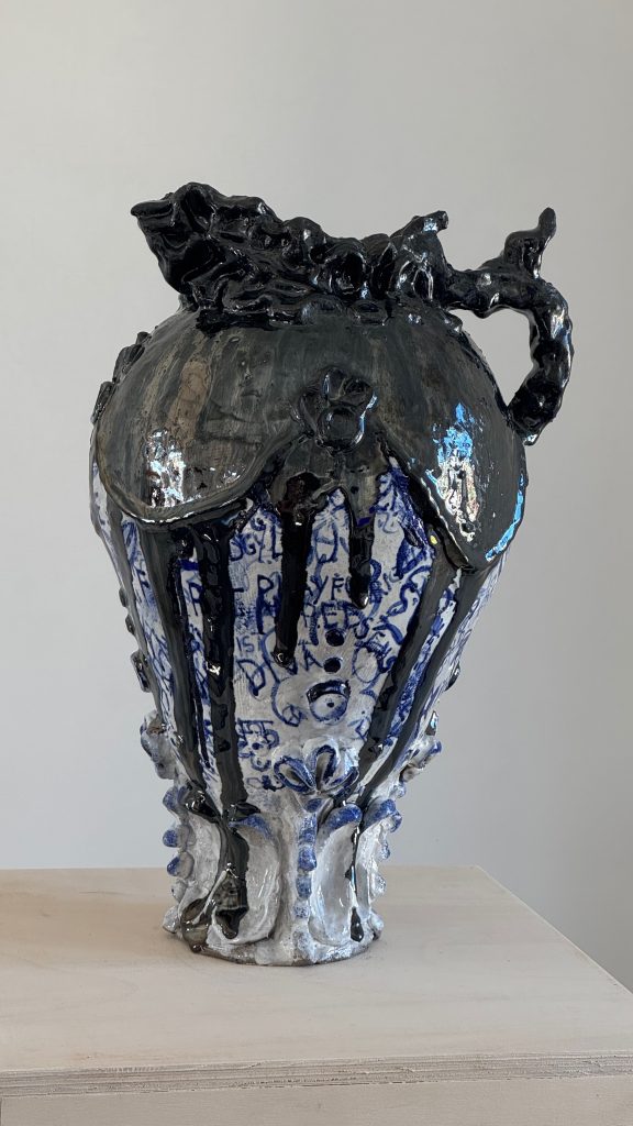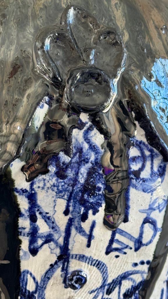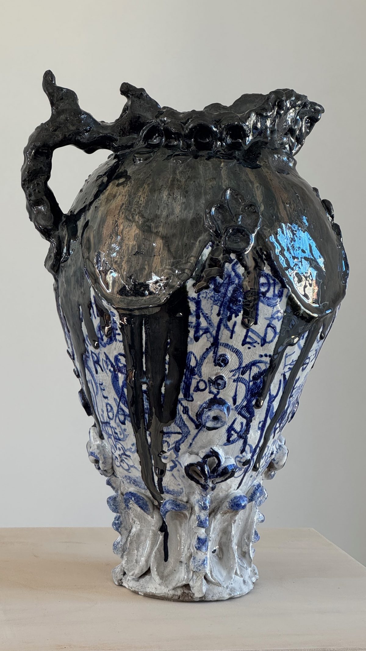 A thick, glossy black layer of glaze drips across parts of the surface.