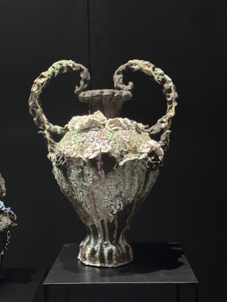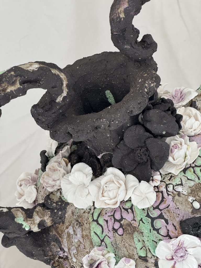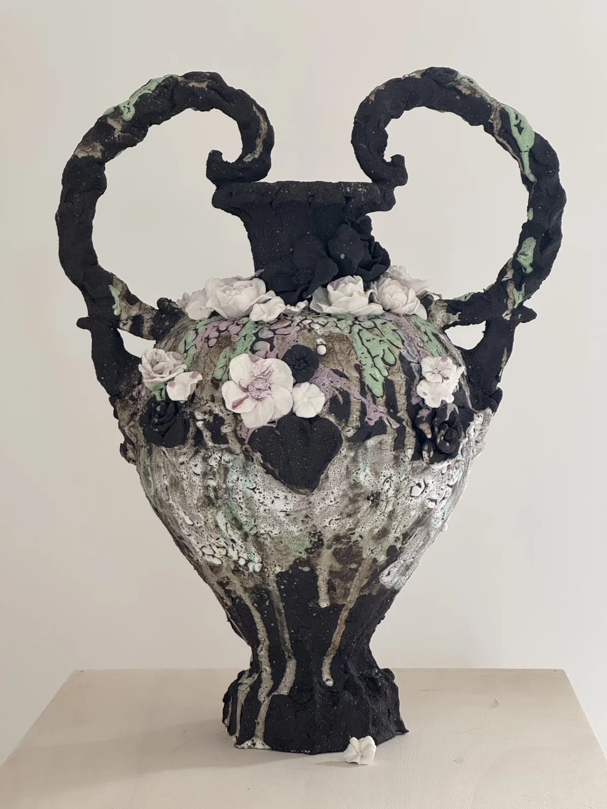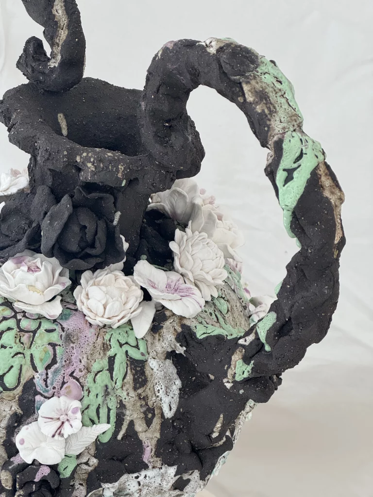Un trophée en grès sombre qui refuse d’obéir. Sa forme est lourde, rugueuse et assumée. La surface porte de petites fleurs émaillées vertes et roses, avec des coulures et des traces qui suivent leur propre chemin, et non celui attendu. Une pièce pour ceux qui préfèrent la sincérité au lissage, et l’expression à la retenue.